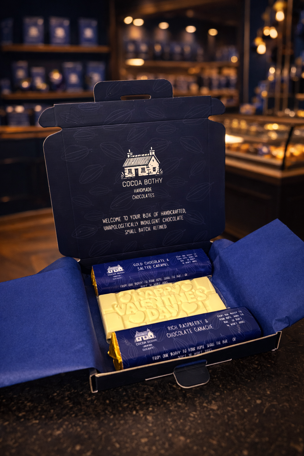 This is Cocoa Bothy’s idea of romance in a box. Three beautiful Belgian chocolate bars come together to create the ultimate little love letter.